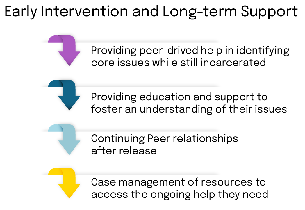 By working with those currently incarcerated to establishing relationships that carry over into reentry, we believe trauma and substance use disorders can be identified, and that individuals can be given the tools and support to manage their conditions.